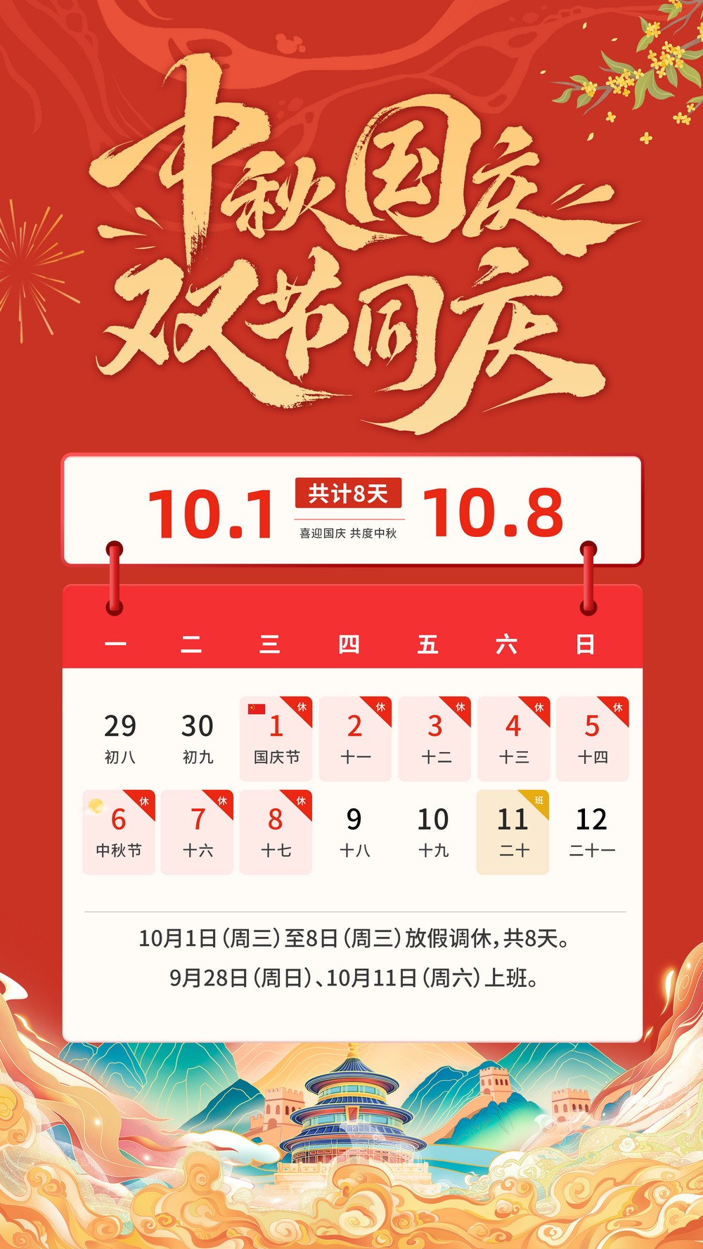 1、2025年10月1日至8日放假,共8天。9月28日(周日)、10月11日(周六)正常上班。